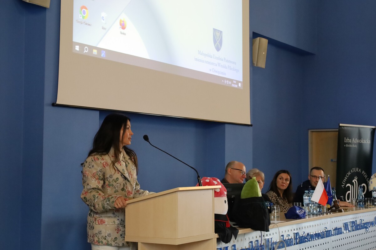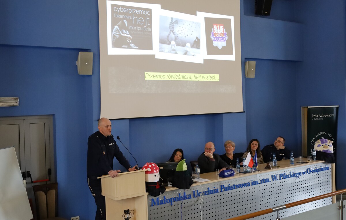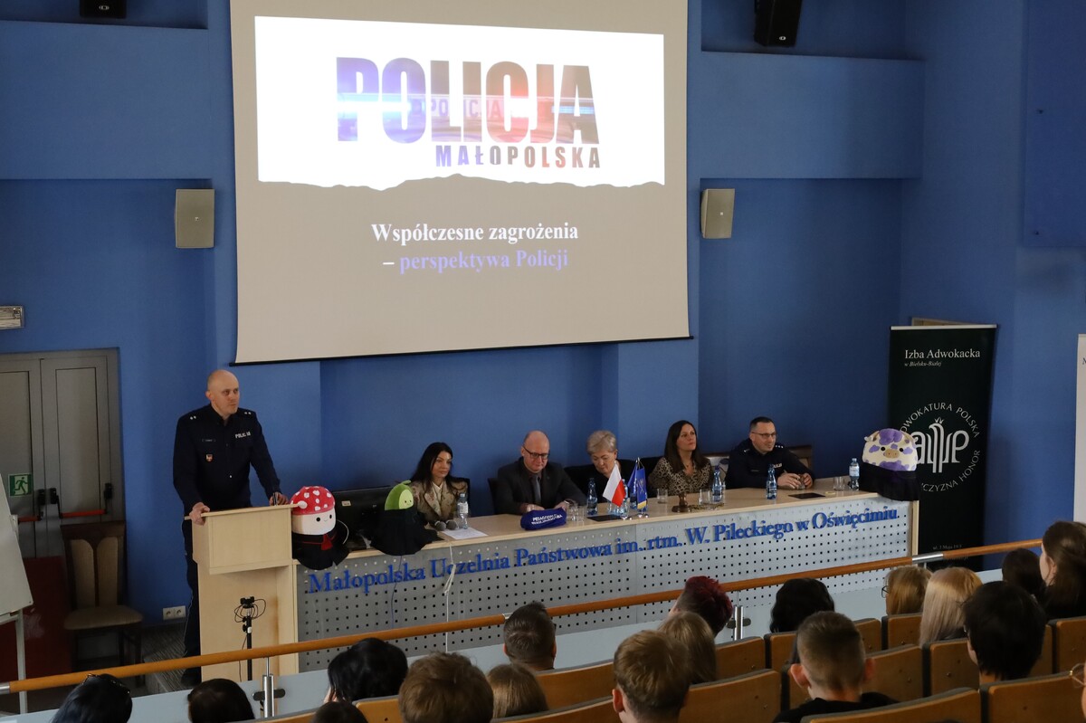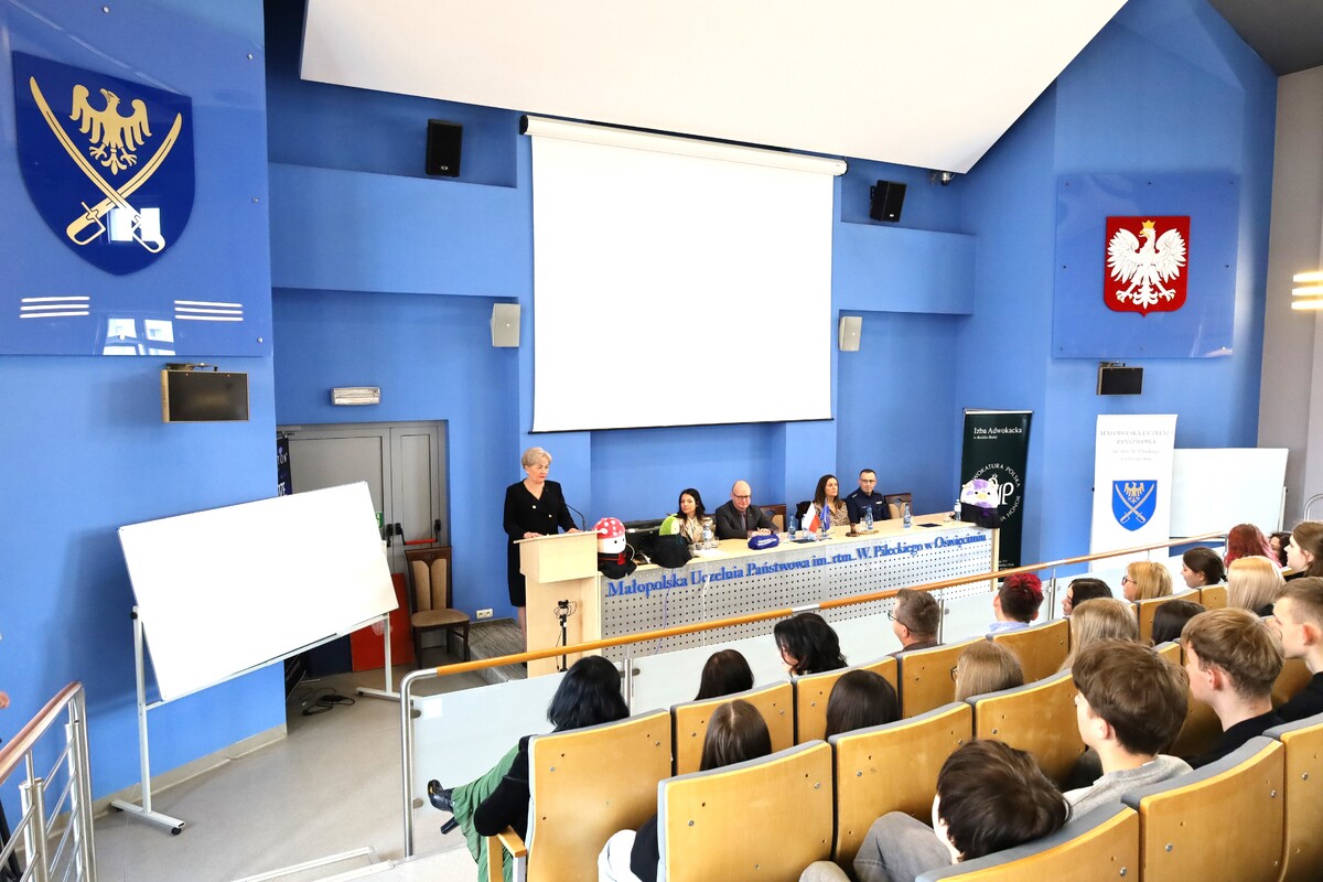 W środę (25.03.2026) w Małopolskiej Uczelni Państwowej im. Rotmistrza Witolda Pileckiego w Oświęcimiu, odbyło się seminarium szkoleniowe dla studentów oraz młodzieży ze szkół ponadpodstawowych, poświęcone tematyce przestrzegania prawa, bezpieczeństwu oraz pedagogice resocjalizacyjnej. Prelegentami byli przedstawiciele uczelni oraz zaproszeni goście, reprezentujący: Sąd, Prokuraturę, Policję oraz Adwokaturę. Seminarium zorganizował Zakład Pedagogiki Resocjalizacyjnej w Instytucie Nauk Humanistycznych i Społecznych Małopolskiej Uczelni Państwowej w Oświęcimiu.