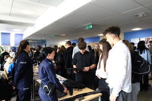 Na policyjnym stoisku promocyjno-profilaktycznym Komendant, rzeczniczka prasowa, policjantki z Zespołu ds. Nieletnich i Patologii oraz profilaktyk Wydziału Ruchu Drogowego, prezentując sprzęt policyjny, radiowóz i motocykl, zachęcali młodych ludzi do wstąpienia do służby w Policji.