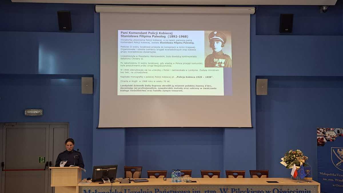 asp. szt. Małgorzata Jurecka, oficer prasowy Komendanta Powiatowego Policji w Oświęcimiu, zaprezentowała sylwetkę oraz osiągnięcia Stanisławy Filipiny Paleolog, pierwszej pani Komendant Policji Kobiecej, która była inicjatorką służby kobiet w Policji. Widziała ona w kobietach ogromny potencjał, niezbędny w zwalczaniu grup przestępczych zajmujących się handlem ludźmi, które w tamtych czasach działały na ogromną skalę. Uważała, że kobiety doskonale sprawdzą się w zwalczaniu przestępczości przeciwko rodzinie, a także w opiece nad porzuconymi, osieroconymi dziećmi. Wiedziała, że kobietom łatwiej przyjdzie zrozumienie położenia, w którym znalazła się wykorzystana i upokorzona kobieta, czy osierocone dziecko.