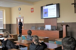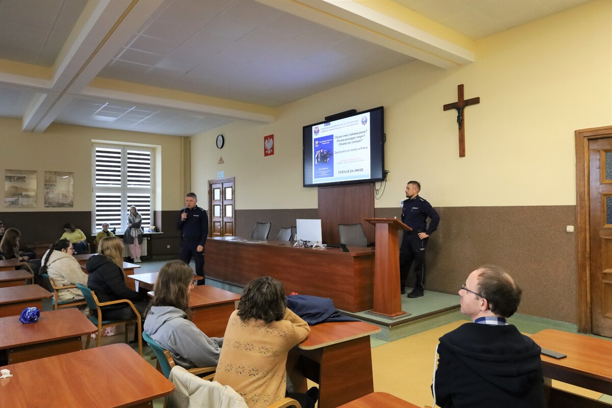 W czwartek (26.03.2026) insp. Piotr Dziekanowski, asp. szt. Dariusz Jakubowski Zastępca Naczelnika Wydziału Prewencji oraz asp. szt. Małgorzata Jurecka oficer prasowy, spotkali się z uczniami klas maturalnych Zespołu Szkół Zawodowych Towarzystwa Salezjańskiego w Oświęcimiu, prezentując im możliwość wstąpienia do służby w Policji.