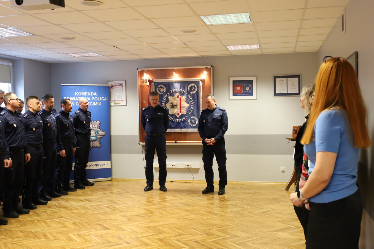 Insp. Piotr Dziekanowski Komendant Powiatowy Policji w Oświęcimiu, policjanci oraz pracownicy Policji powitali nadkom. Jerzego Wilka, który przejął pełnienie obowiązków na stanowisku I Zastępcy Komendanta Powiatowego Policji w Oświęcimiu. Złożyli mu gratulacje oraz życzenia wszelkiej pomyślności w realizacji zadań na rzecz bezpieczeństwa w powiecie oświęcimskim. Natomiast mowo mianowany p.o. I Zastępcy Komendanta, w swoim przemówieniu zapewnił o pełnej gotowości do służby na nowym stanowisku, a także realizacji zadań związanych z dbaniem o bezpieczeństwo mieszkańców powiatu oświęcimskiego.
