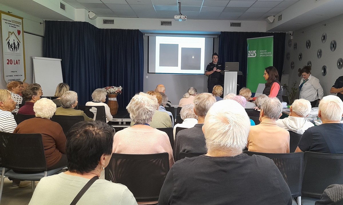Przedstawicielki Zakładu Ubezpieczeń Społecznych przedstawiły prezentację poświęconą nowym świadczeniom przysługującym seniorom. Opowiedziały w jaki sposób i gdzie należy złożyć dokumenty, aby uzyskać odpowiednie świadczenie. Z kolei dzielnicowy, policjantka z Zespołu ds. Nieletnich i Patologii oraz oficer prasowa z oświęcimskiej komendy Policji przedstawili seniorom tematy z zakresu prewencji kryminalnej oraz bezpieczeństwa pieszego i rowerzysty w ruchu drogowym.