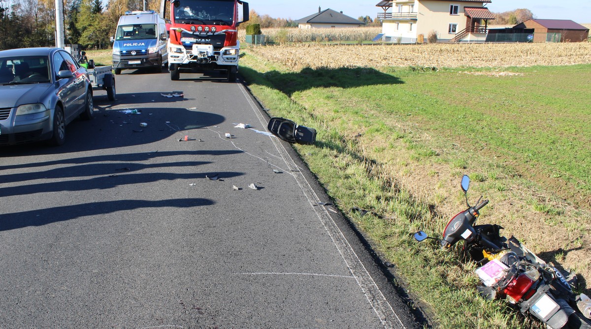Jak wstępnie ustalili policjanci 81-letni mieszkaniec gminy Osiek, jadąc na skuterze, podczas próby ominięcia stojącego na jezdni samochodu marki VW, którym kierował 56–letni mieszkaniec powiatu wadowickiego, uderzył w przyczepkę znajdującą się za samochodem. W wyniku zdarzenia motorowerzysta doznał obrażeń ciała. Pod opieką ratowników medycznych został przewieziony na badania do szpitala.